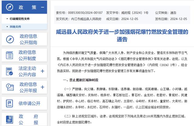 内江市公安局治安支队相关负责人介绍,案发时,威远已出台新的烟花爆竹的政策,明确了威远县禁止燃放的区域,同时为了让人民群众过年“有年味”,在禁止燃放的区域以外规定了部分地区限制燃放的时段。