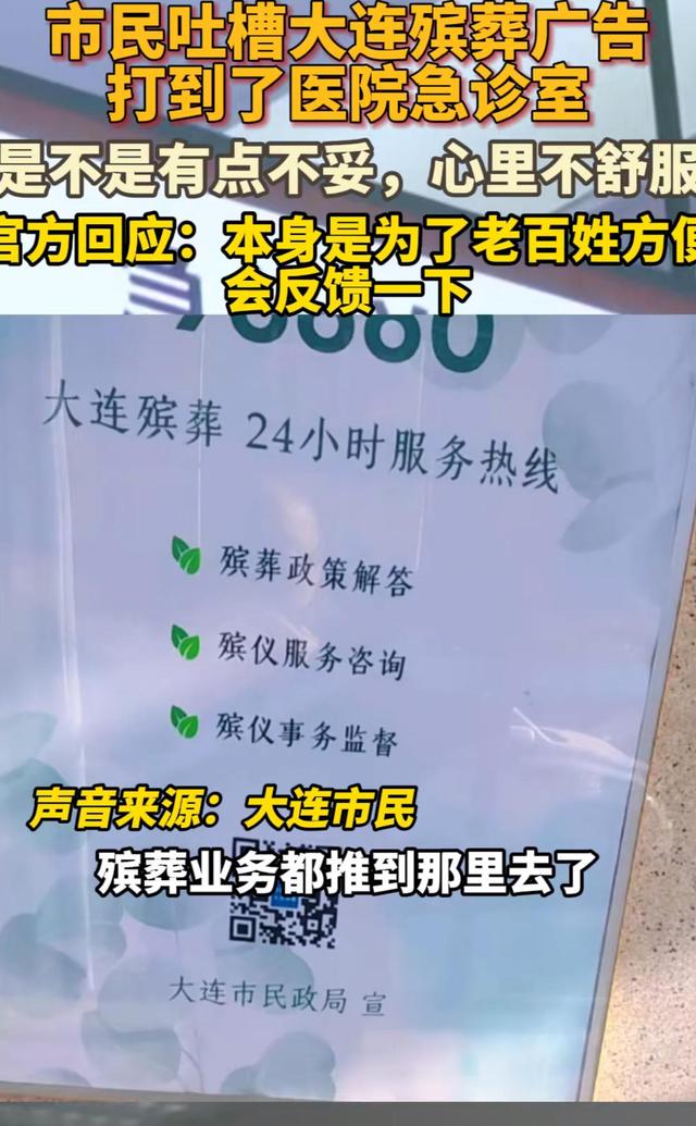 近日,有媒体发布视频称,辽宁大连有市民吐槽“大连殡葬服务广告打到了医院急诊室,感觉心里不舒服”。视频显示,市民吐槽的展示牌上写着:“大连殡葬24小时服务热线”“殡葬政策解答”“殡仪服务咨询”“殡仪事务监督”,下方写有“大连市民政局宣”。