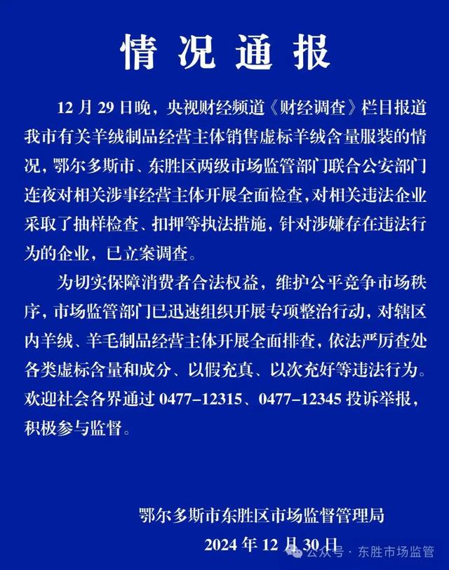 鄂尔多斯市东胜区通报“有关羊绒制品经营主体销售虚标羊绒含量服装”:已立案调查