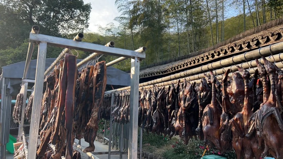 做酱鸭可不是轻松的活,山庄里的阿姨和周边的村民们每天凌晨三点就要开始杀鸭、推毛、挂晒沥干。等水分完全晒干之后,再放到事先煮好冷却的酱油里。