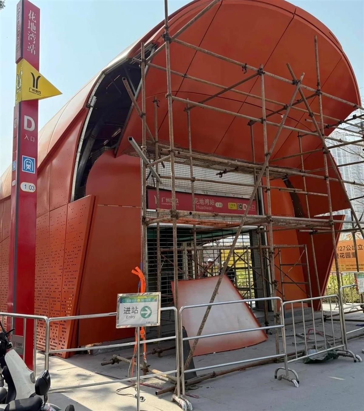 网传资料显示,花地湾站D出入口外立着脚手架,疑似尚未完工,其整体外形引发众多网友吐槽。