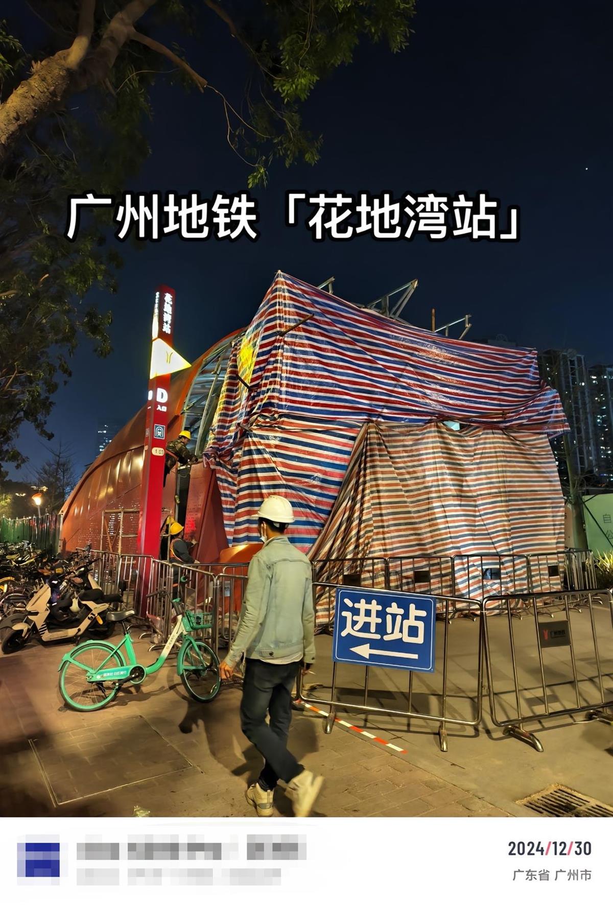 12月31日上午,目击市民告诉记者,30日晚,花地湾地铁站口进行了遮挡,引发争议的外观正在拆除。31日上午,该市民看到争议出入口外观已基本拆除,暂时只剩框架,也露出了地铁口的本来样子。