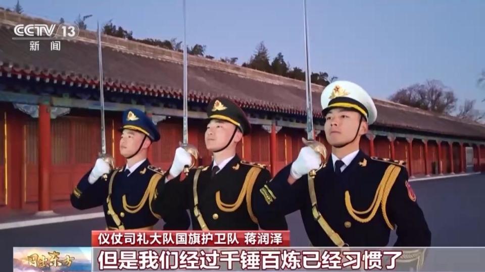 仪仗司礼大队国旗护卫队 蒋润泽:我们三名分队长刀柄、刀鞘都要一致,手一僵动作会变形,但是我们经过千锤百炼已经习惯了,再冷我们也会把动作做完全。