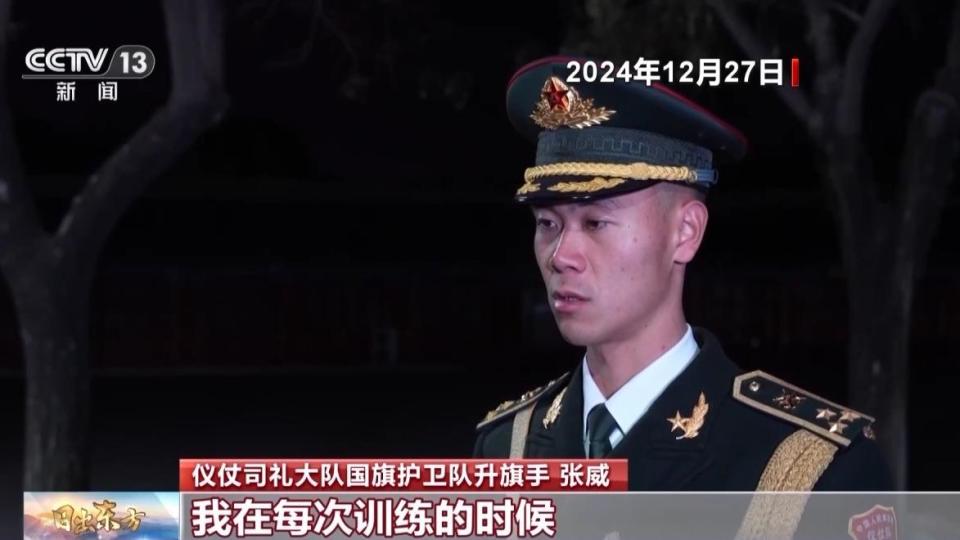 仪仗司礼大队国旗护卫队升旗手 张威:我在每次训练的时候跟任务的着装都是一样的,就是为了确保能够动作无误,在手僵硬的情况下,也要流畅做到每一个动作。