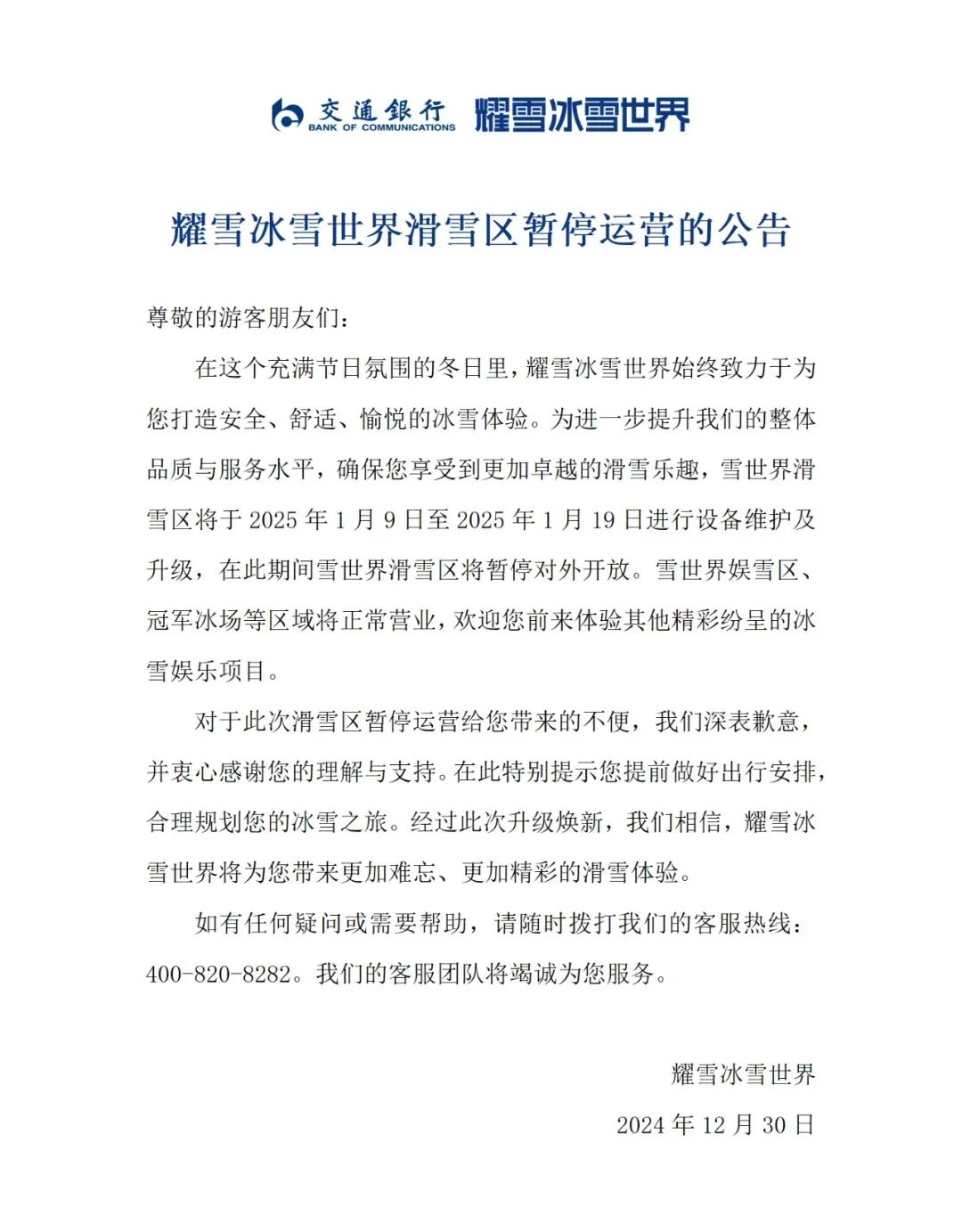 对于此次滑雪区暂停运营给您带来的不便,我们深表歉意,并衷心感谢您的理解与支持。在此特别提示您提前做好出行安排,合理规划您的冰雪之旅。经过此次升级焕新,我们相信,耀雪冰雪世界将为您带来更加难忘、更加精彩的滑雪体验。