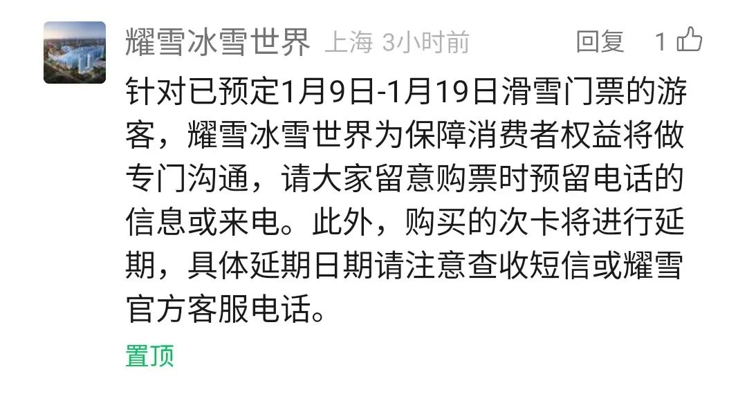 针对已预定1月9日-1月19日滑雪门票的游客,耀雪冰雪世界为保障消费者权益将做专门沟通,请大家留意购票时预留电话的信息或来电。此外,购买的次卡将进行延期,具体延期日期请注意查收短信或耀雪官方客服电话。