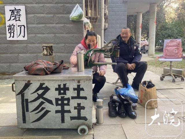 大皖新闻记者采访获悉,大妈名为童来林,年轻时曾是泥瓦工,为别人盖房子,付出了辛勤的汗水。不到30岁,她跟随表姑学到了修鞋手艺,从此开始了与针线、皮革相伴的日子。大叔名为王正中,曾是木匠,因为木匠要磨刨刀,所以会磨刀。他们回迁到这个小区已十几年了,搬来时起就在这里摆起了摊。