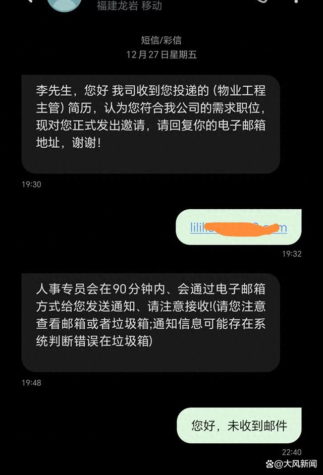 到了12月27日,李先生手机突然接到信息称:“您好,我司收到你投递的(物业工程主管)简历,认为你符合我公司的需求,现在正式对你发出邀请,请回复你的电子邮件地址。”短信还提醒“人事专员会在90分钟内,通过电子邮箱方式给您发送通知、请注意接收! ”
