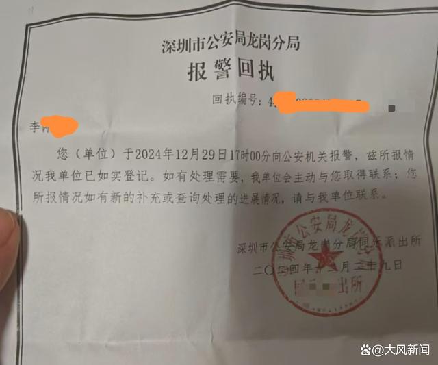李先生提供的深圳市公安局龙岗分局报警回执显示:您(单位)于2024年12月29日17时00分向公安机关报警,兹所报情况我单位已如实登记。如有处理需要,我单位会主动与您取得联系;您所报情况如有新的补充或查询处理的进展情况,请与我单位联系。