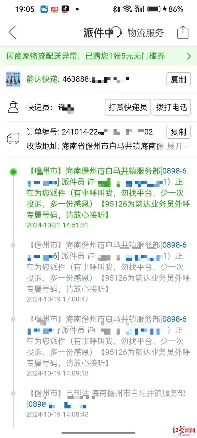 “我是北京人,每年冬天都会和家人到海南过冬。居住在这边的时候,我们也会进行网购,收件地址就填的所在镇的某小区。”李先生告诉红星新闻,他目前居住在儋州市白马井镇某小区,但其发现近两个月自己网购的商品都难以取到,“快件只要到了这边镇上,就会被送到小区附近的邮政驿站,很难有送货上门的。但我每次去驿站,要么没有取件码,要么物流显示丢件或者被擅自退回给商家了。”
