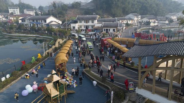 竹韵咖啡门口,充满文艺气息的场景吸引了众多游客。有人手持毛笔,在竹简上一笔一划书写着新春对新村的赞美与祝福,墨香四溢;另一侧,游客们眯着眼,全神贯注地瞄准竹壶,用力投掷竹箭,欢笑声、喝彩声不断。村内更是趣味横生,竞技垂钓区鱼竿林立,钓友们静待鱼儿上钩;欢乐套圈场地内,套圈在空中划过一道道弧线;快乐捞小鱼区域,孩子们拿着小网兜,兴奋地追逐着水中游弋的小鱼。游玩途中,还时不时能偶遇环村腰鼓队,他们身着鲜艳服饰,鼓声阵阵,为整个村庄增添了喜庆氛围。游客汤喻淇满脸笑容地说道:“这里太好玩了,好吃的、好玩的一应俱全,还有好多打卡点,我玩得特别开心。”