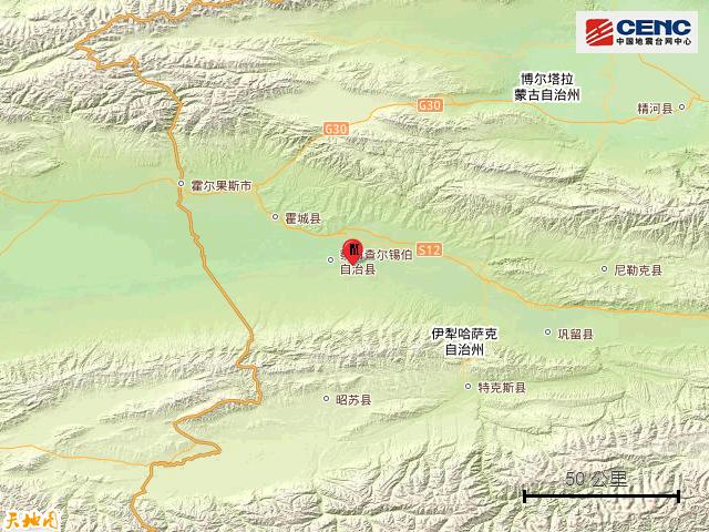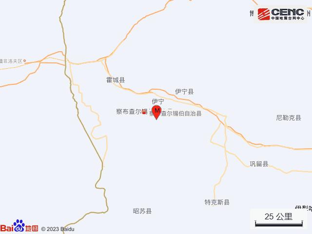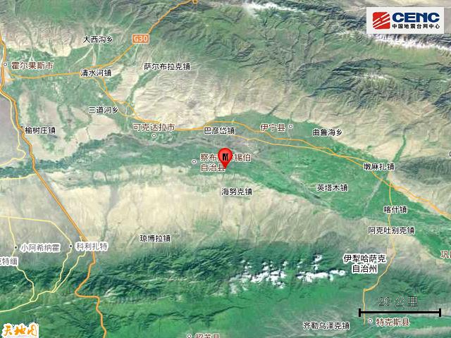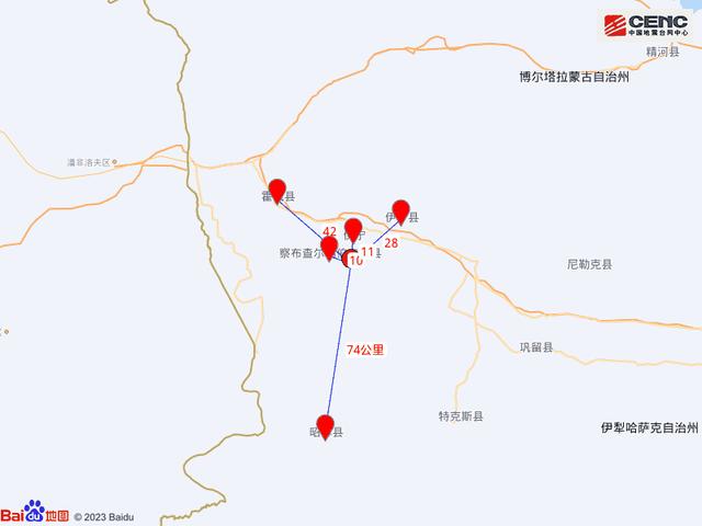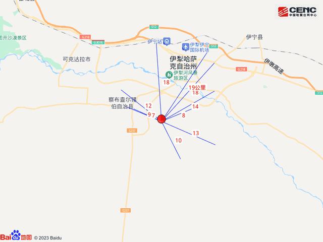 周边县城:震中距察布查尔锡伯自治县10公里、距伊宁市11公里、距伊宁县28公里、距霍城县42公里、距昭苏县74公里,距伊犁哈萨克自治州13公里,距乌鲁木齐市511公里。