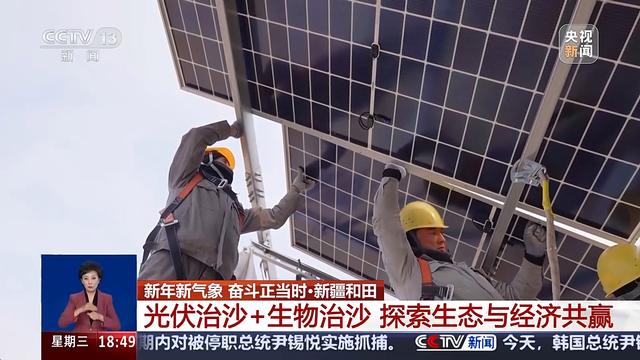 除了为生物治沙作准备,塔克拉玛干沙漠中还有不少光伏项目正在建设,工人们加紧铺设光伏板,到春天,光伏板下还会种上苜蓿、狼尾草等固沙植物,这处包含光伏治沙、生物治沙的锁边工程拓宽项目,也将成为新疆探索生态治理与经济发展共赢的一个新模式。