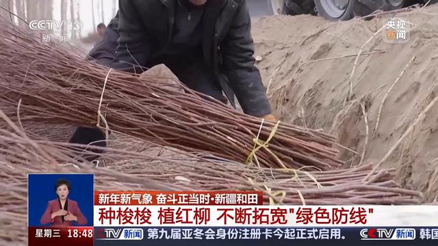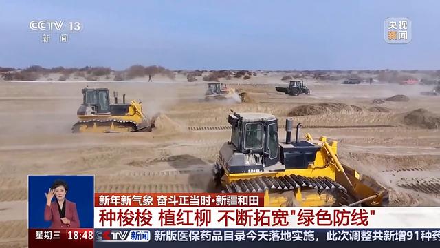 总台记者 高鹏飞:这里是塔克拉玛干沙漠南缘的和田于田县,这两天沙漠里面迎来了一场降雪,这会气温在零下10℃左右,非常寒冷,但是,在我旁边就是一处热火朝天的沙漠治沙现场。