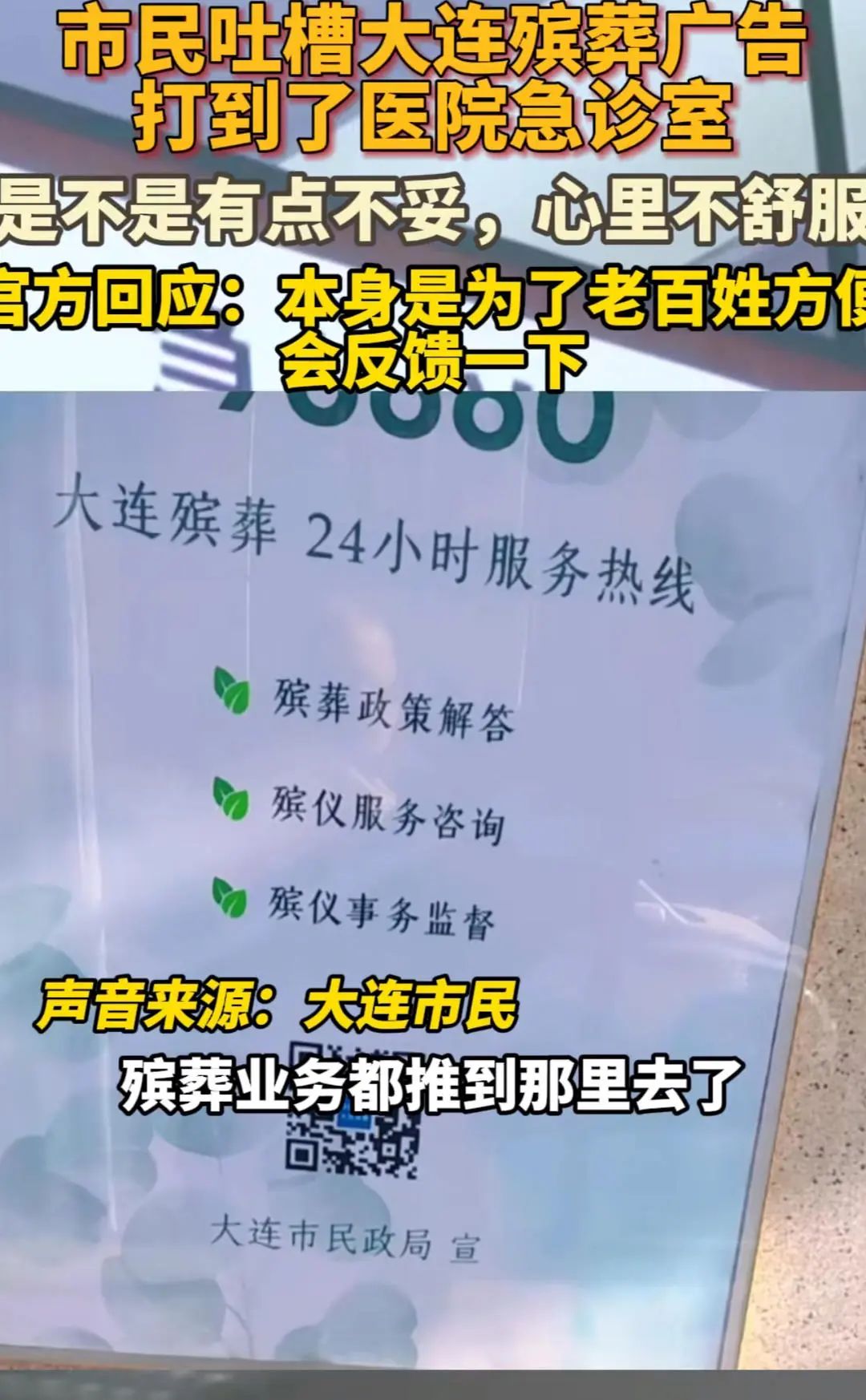 2024年12月28日,大连一市民发现,在当地一医院急诊室墙上有殡葬服务的广告,其认为,“治病救人的地方,殡葬业务推到那里去了,让人看了心里不舒服,这是否欠妥。”