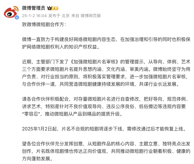 1月2日,新浪微博社区管理官方微博发布公告称,将进一步加强微短剧片名审核;2025年1月2日起,片名不合规的短剧将逐步下线,需修改通过后才能恢复上线。微博表示,请各合作伙伴积极配合,对存量微短剧片名进行自查修改,把好导向、规范体例、讲求艺术,特别是针对不良价值观导向、违反公序良俗、低俗擦边等违规内容要“零容忍”,推动微短剧从产品到精品的提质升级。
