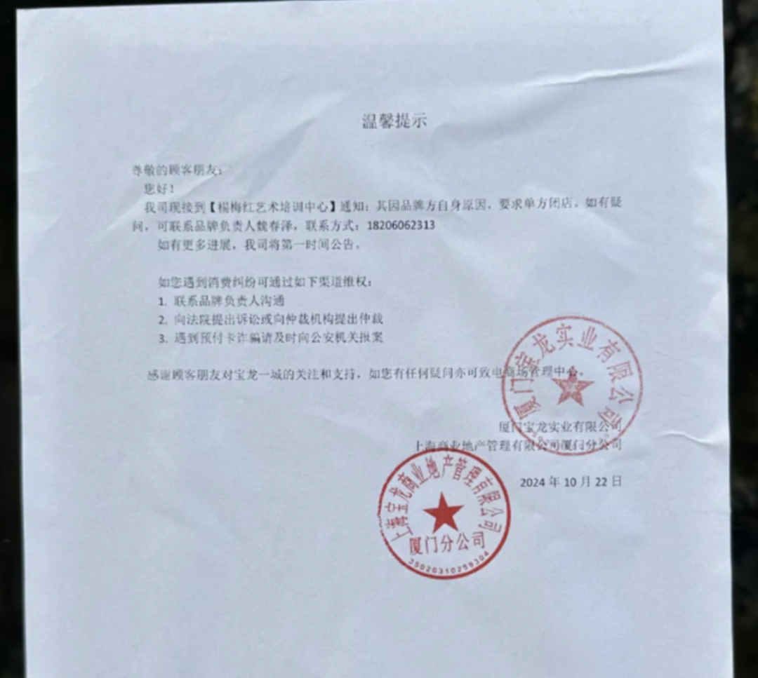 一纸冰冷的“闭店通告”,随之而来的是聊天群解散、负责人电话“无人接听”、机构紧闭大门,以及遥遥无期的退费……近日,厦门知名美术连锁培训机构杨梅红艺术教育在厦门的3家门店突然同时宣布闭店,且表示无力向家长退费。事情发生后迅速登上微博热搜,数百名还有剩余课时的家长维权困难。