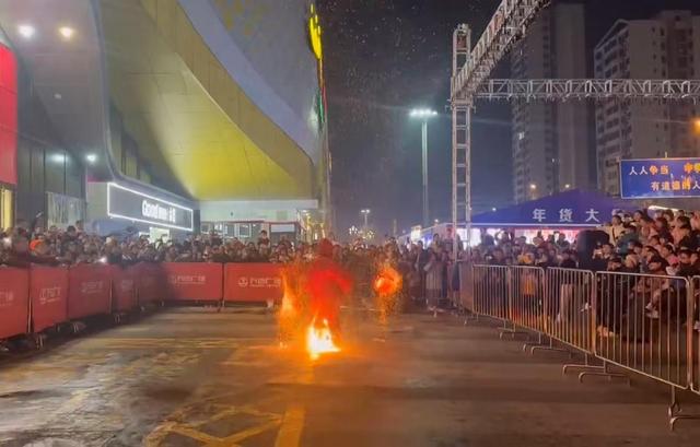 网友拍摄的视频显示,在该广场一块空地上,一名身着红袍的表演者奋力挥动手中的铁网,瞬间火星漫舞,如金沙集聚,似灿星飞舞,灵动跳跃的火花璀璨夺目,围观的人群中发出阵阵惊叹和欢呼声。不料,表演进行了半分钟左右,火花将表演者红袍引燃,其并未第一时间察觉。约10秒后,表演者才发现引火烧身,赶紧丢掉手中的铁网,绕场奔跑跳跃,试图灭火。随后,其脱掉红袍后裤腿处仍在燃烧。最终,工作人员上场用灭火器才将火扑灭。