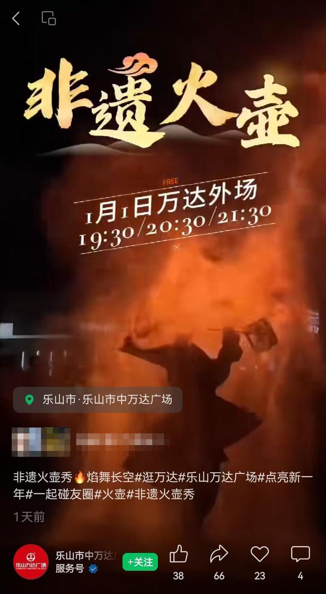 据媒体报道,有目击者表示,因演员裤腿被引燃小腿处有烧伤,现场工作人员为演员进行了临时烧伤处理。2日,该商场客服人员称,受伤演员已送医正在治疗中。红星新闻记者查询发现,认证为乐山万达广场商业管理有限公司的视频号曾发布跨年系列活动预告,称1月1日晚万达广场外举行三场“非遗火壶秀”。