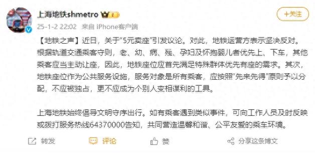 1月2日,上海地铁发文表示:“近日,关于‘5元卖座’引发议论。对此,地铁运营方表示坚决反对。”