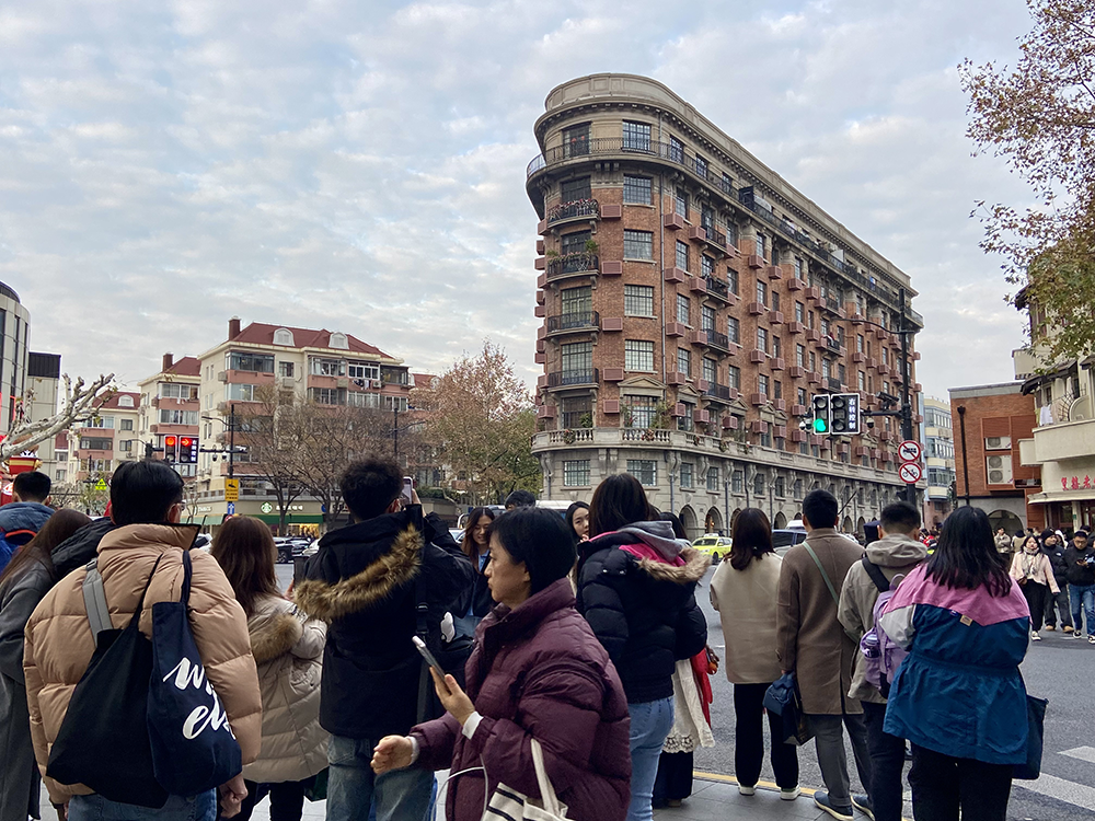 站在“百岁网红”武康大楼的路口,寒风瑟瑟,人群里有人捧着奶茶,也有人拿着冰淇淋,一时有些冷暖混乱。距离最近的奶茶店,新订单源源不断,店员们忙活得一刻不停,其中一位见缝插针地告诉记者:“各个国家的游客都有,韩国人比较多,点单的时候能听出来,要给他翻译饮品单,我们用手机翻译。”