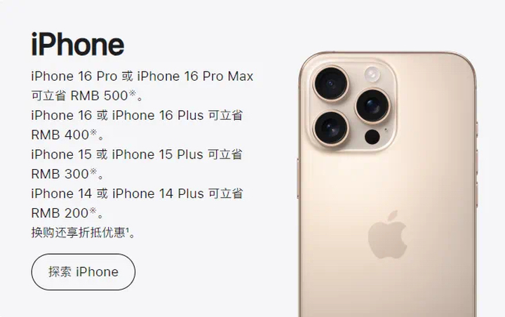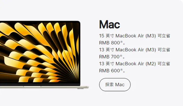苹果官网介绍,活动期间以符合条件的支付方式购买指定商品,每位顾客每个产品类别限购2件,最高立省800元人民币,换购新iPhone还享折抵优惠。iPhone16Pro系列降500元,iPhone16降400元,MacBookAir15英寸降800元,MacBookAir13英寸降700元。