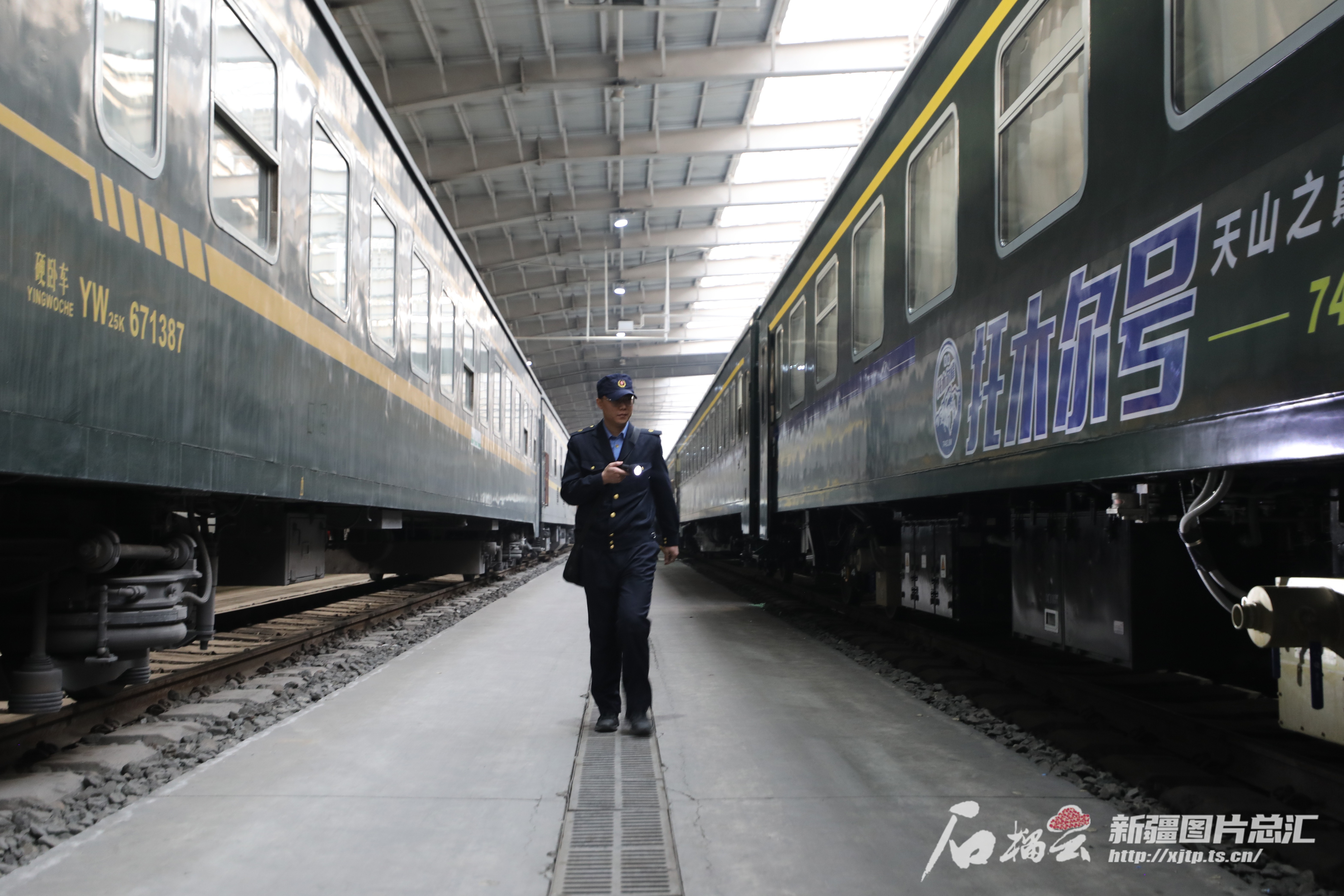 铁路工作人员在检查“托木尔号”列车。摆风亮摄