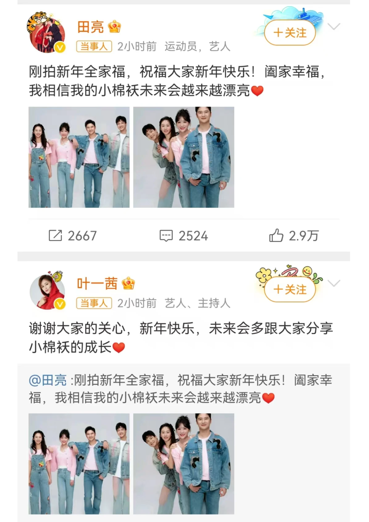 就在今天中午,田亮再次发文,晒出了一家人的新年全家福,祝福大家新年快乐,阖家幸福。他还表示:“我相信我的小棉袄未来会越来越漂亮!”与此同时,叶一茜也分享了对网友们的感谢,表示:“谢谢大家的关心,新年快乐,未来会多跟大家分享小棉袄的成长。”