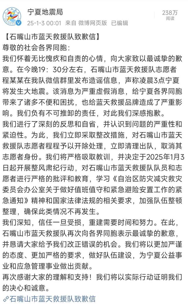 1月2日晚,石嘴山市蓝天救援队因有队友造谣而发布致歉信,称在当晚7点30分左右,该队志愿者程某某在微信群发布造谣信息,声称“凌晨3点宁夏将发生大地震”。该消息为严重虚假消息,宁夏地震局等多部门发布了辟谣信息。