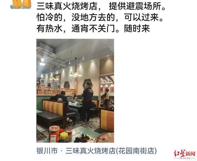 红星新闻记者了解到,1月2日晚银川较为寒冷,最低气温低至零下10多摄氏度。为了给一些避险居民提供方便,银川有餐厅提供“避震场所”。金凤区一家烧烤店的老板秋香在朋友圈发布消息,“怕冷的,没有地方去的,可以过来。有热水,通宵不关门。”