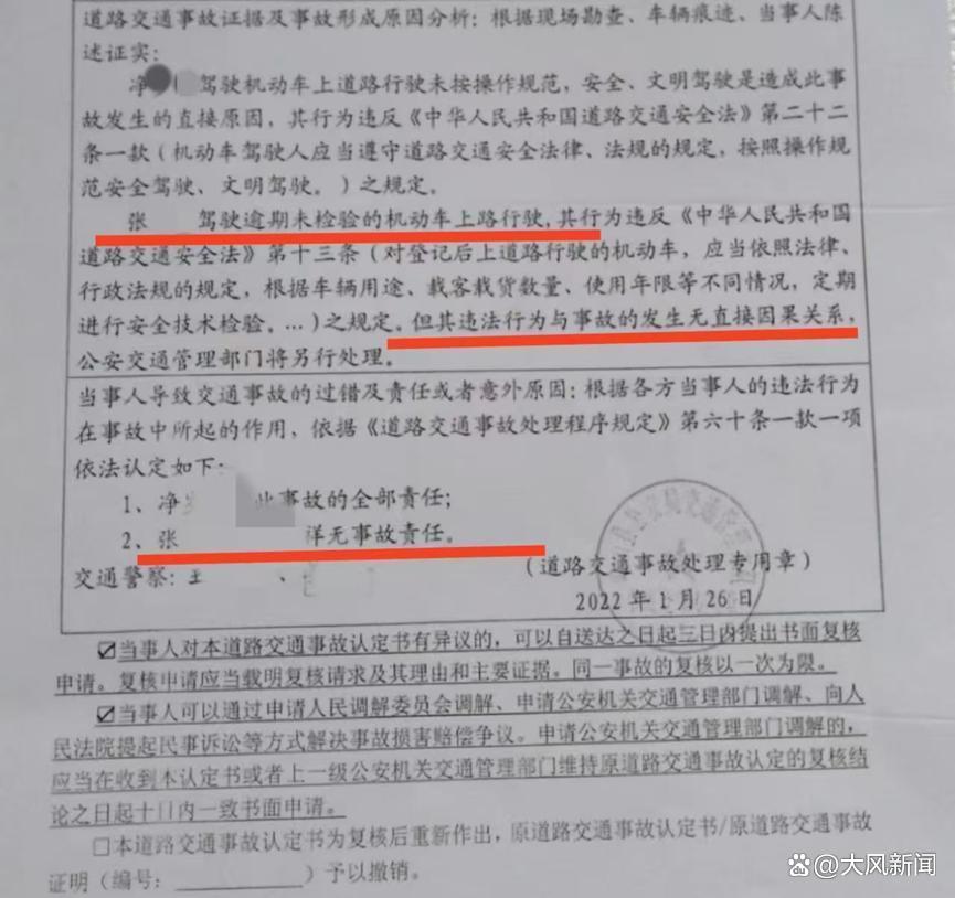 交警出具的事故认定书显示,张先生驾驶的车辆未经年检,但是在“此次事故中无事故责任”
