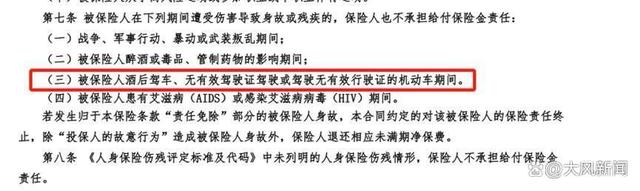 朱长江表示,依据《保险法》的相关规定,保险人剥夺被保险人的理赔权利,需要用格式条款的方式订立合同,且需对投保人进行必要的提示,因此,判断保险公司以合同条例拒赔是否合法合理,还应关注合同条款中因“被保险人酒后驾车、无有效驾驶证驾驶或驾驶无有效行驶证的机动车期间造成被保险人身故或残疾的,保险人不承担给付保险金责任。”及其中在条款【释义】一栏又进一步表示的“驾驶无有效行驶证的机动车包括未在规定检验期限内进行机动车安全技术检验或检验未通过的机动交通工具。”是以何种方式在合同中出现的,是否足够醒目,起到提示投保人的作用。
