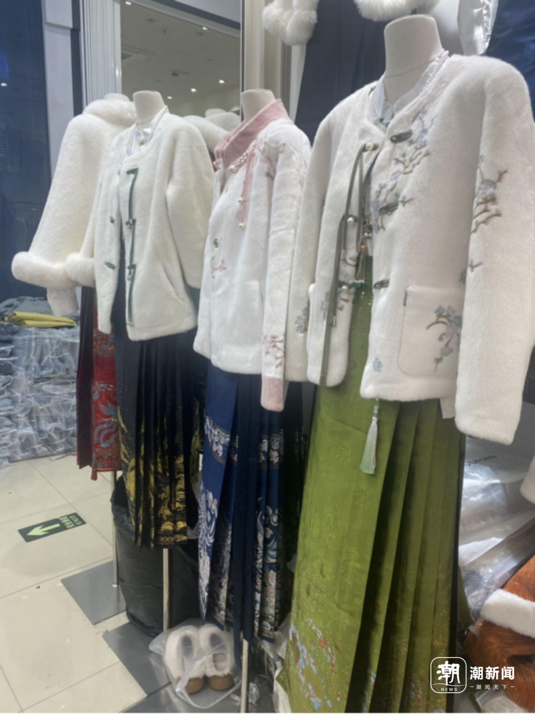 “姐妹服饰”店铺的老板指着一排挂满马面裙的货架介绍:“马面裙过去一整年都卖得很好,什么季节都能穿,客户都是一次订几千件。”
