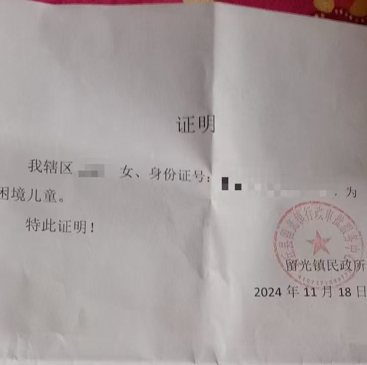 柴先生告诉记者,他女儿小惠(化名)今年6岁,他和孩子的母亲已经离婚。因为前妻患有急性腰椎间盘突出,导致椎管狭窄压迫神经,丧失劳动能力,而自己则患有中度慢阻肺病。2024年11月18日,留光镇民政所将其女儿认定为“困境儿童”。