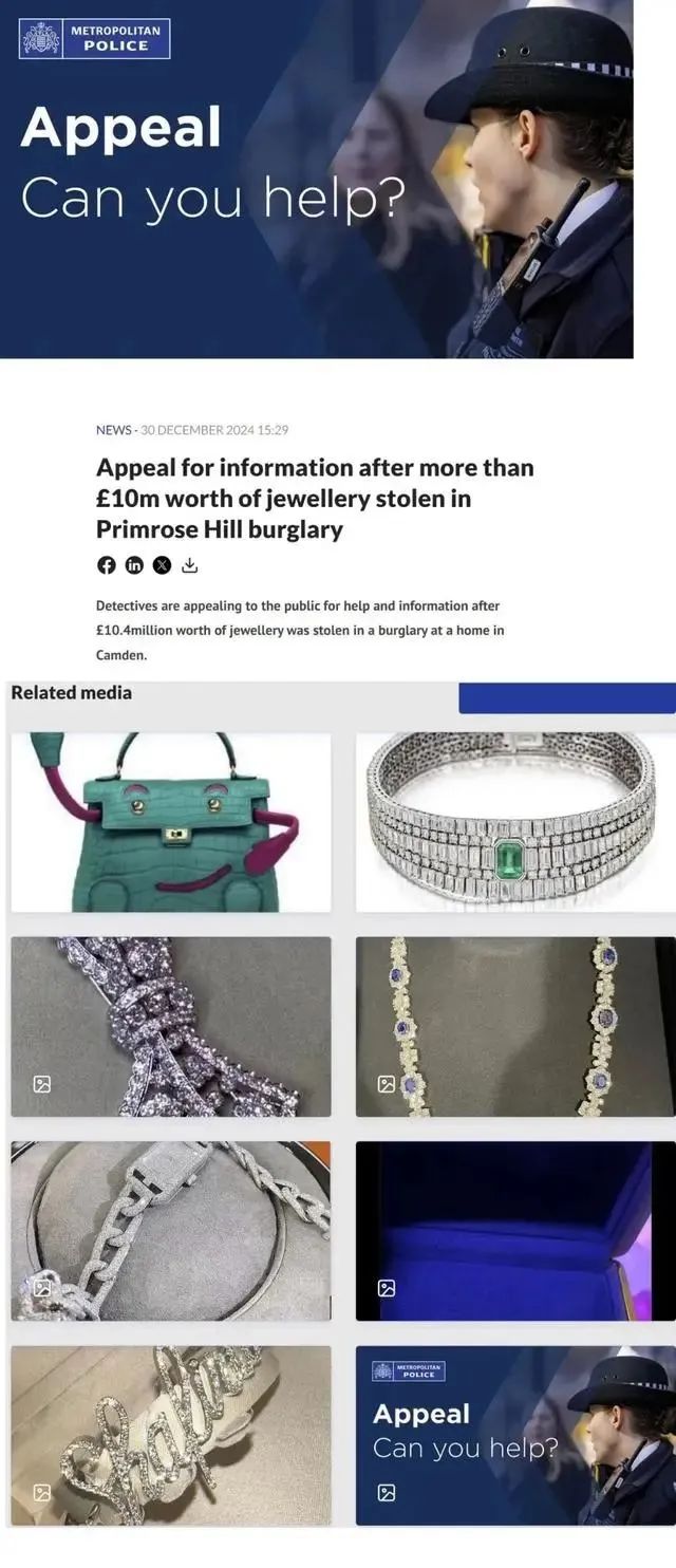 当地警方认为,窃贼可能持有武器,是一名20多岁到30多岁的白人男子。为了调动大家的积极性,Shafira及其丈夫也提供了物质奖励,愿意提供高达150万英镑(约合人民币1374万元)的悬赏金。其中50万英镑用于奖励能提供导致嫌疑人被捕及定罪线索的人,另外100万英镑作为找回被盗物品的回报,相当于被盗物品总价值的10%。