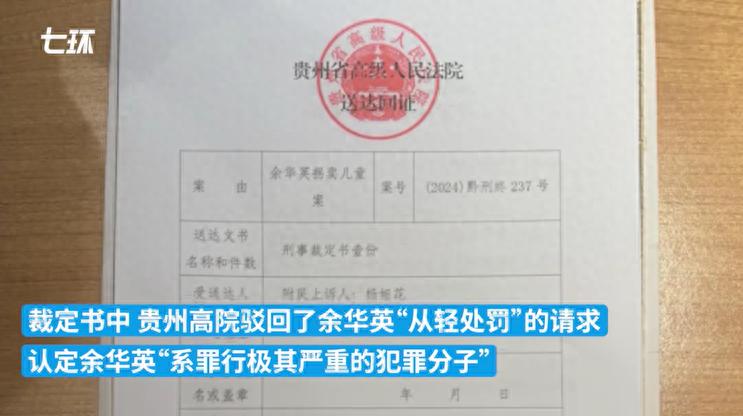 近日,杨妞花收到了代理律师签收的余华英死刑的终审裁定书。贵州高院驳回了余华英“从轻处罚”的请求,认定余华英“系罪行极其严重的犯罪分子”。
