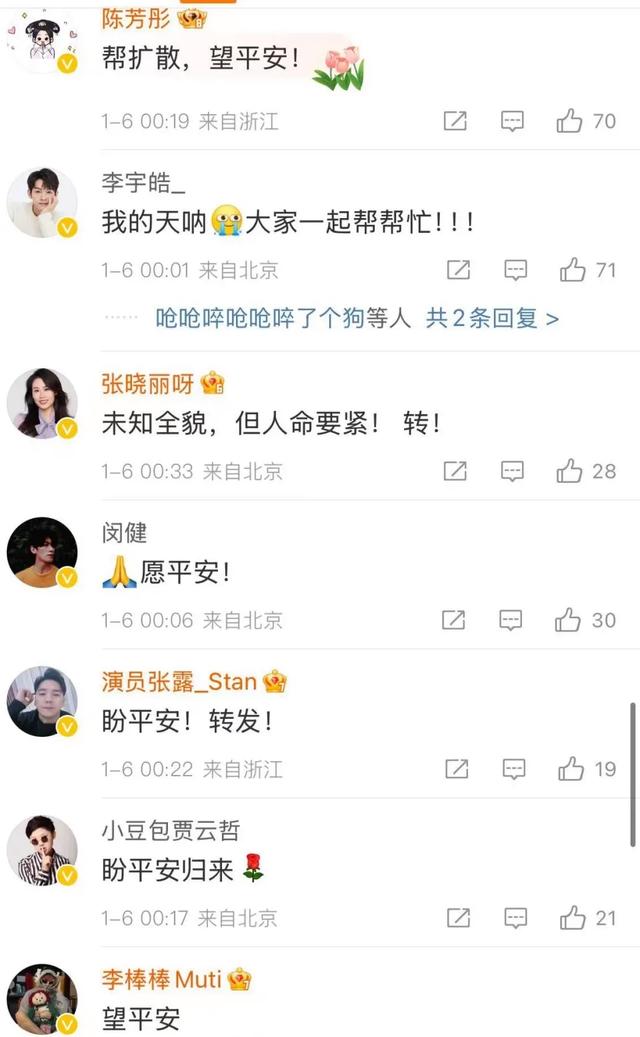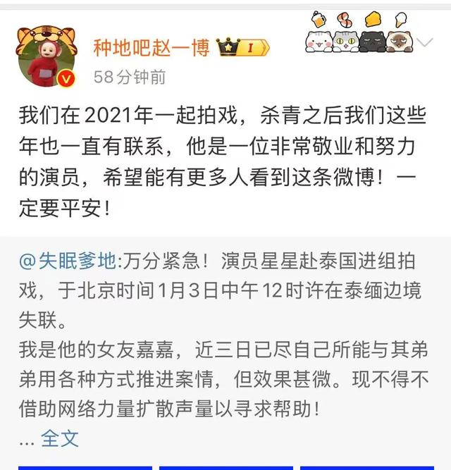《种地吧》嘉宾、演员也转发该文,称:“我们在2021年一起拍戏,杀青之后我们这些年也一直有联系,他是一位非常敬业和努力的演员,希望能有更多人看到这条微博!一定要平安!”