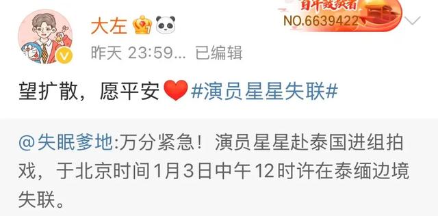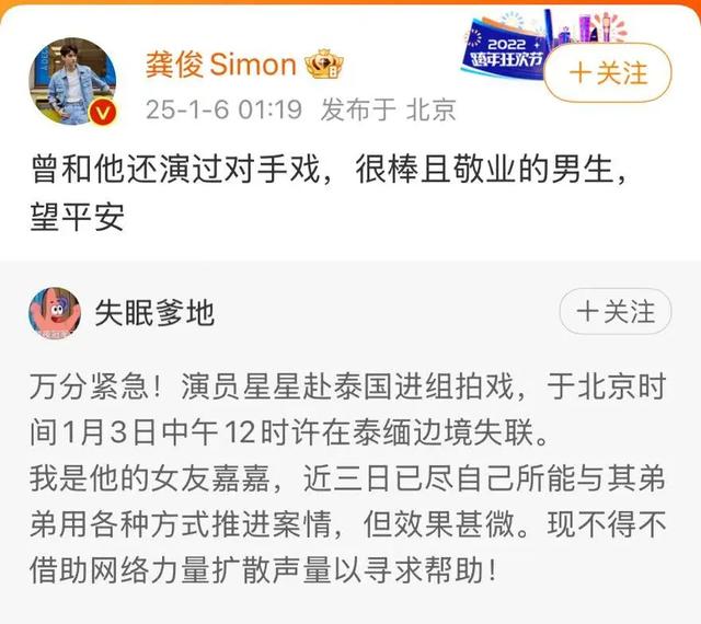 1月5日,自称演员星星的女友嘉嘉@失眠爹地,发文称,演员星星赴泰国进组拍戏,于北京时间1月3日中午12时许在泰缅边境失联。