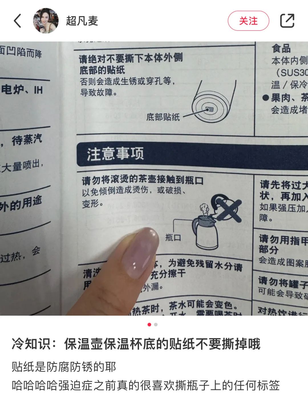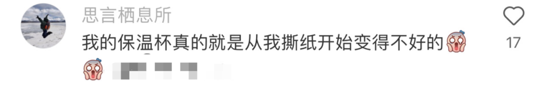 还有撕掉贴纸的网友出来证实,“我保温杯真的就是从撕下标签开始不好的”“吓得我赶紧看看,果然撕了”