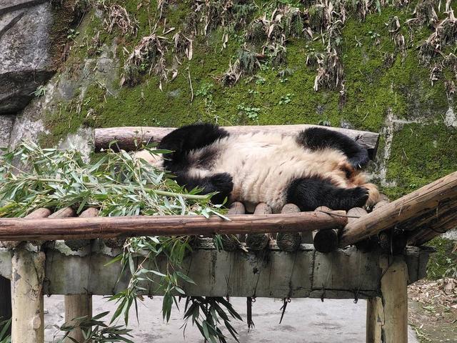 相比之下馆游客爆满的现象,熊猫馆上馆游客较少。“兰香”的展馆就在上馆进门的第一间,而事件的主人公“兰香”正“安逸”地躺在原木搭建的台子上呼呼大睡,身边还有美食——竹子。
