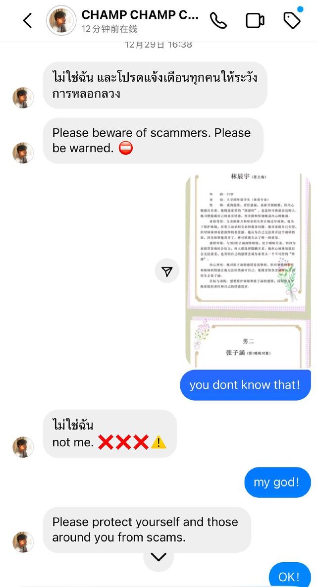 范虎称,由于组讯表上标注的是泰国知名导演champ,他便在社交平台私信询问champ。直到12月29日,他收到导演champ的回复,才知道是假的。范虎发布的聊天记录显示,对于范虎发的组讯图,导演称“not me”,该导演还提醒,“不是我,请大家注意骗局”“请保护自己和身边的人免受诈骗。”