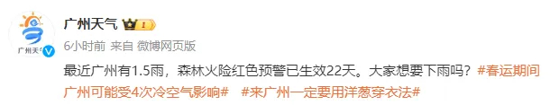 广州市气象台预计,未来一周广州天气继续干燥,广州森林火险红色预警已生效22天。广州天气:有1.5雨(一点无语)......