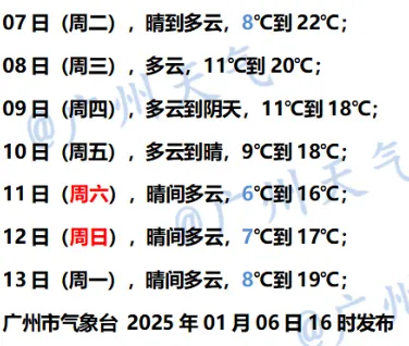 1月6日—7日广州大致天晴,最高气温22℃左右,最低气温8℃左右,昼夜温差大。1月8日,广州云量增多。1月9日—11日中等强度冷空气补充,广州日平均气温下降4~6℃,港区和高地阵风加大至6~8级;1月9日多云到阴天,局部有小雨,1月10日白天开始转晴朗。