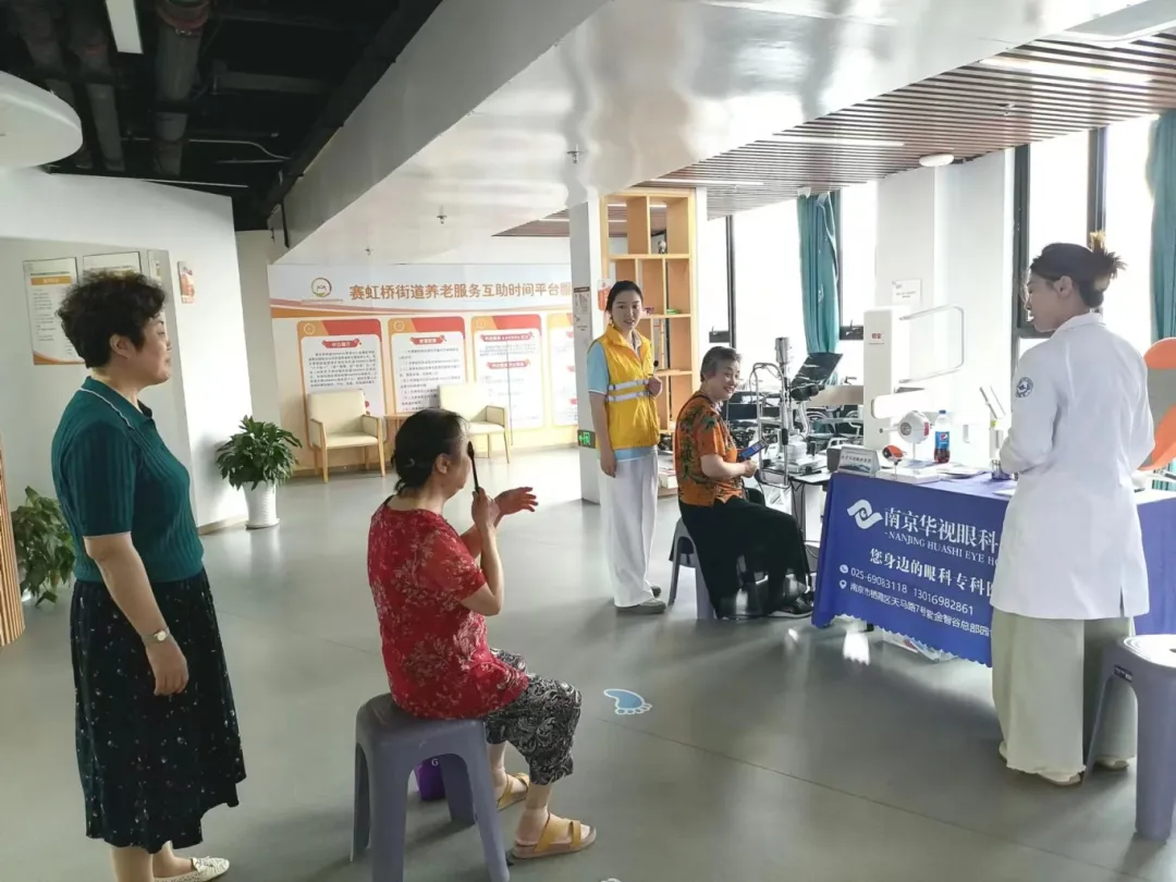 老人们在雨花台区赛虹桥街道的菊花里社区日间照料中心检查视力。街道供图