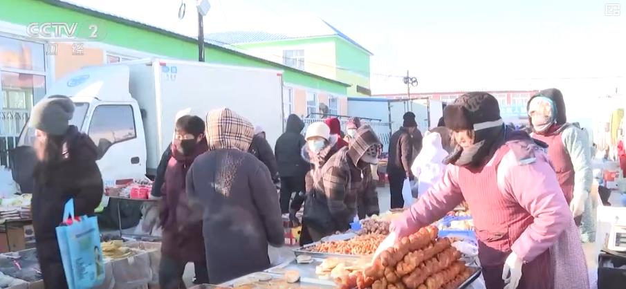 呼伦贝尔市阿荣旗复兴镇的乡镇大集也热闹非凡。自家产的粮食、小笨鸡,冻梨、冻柿子,以及现做的冷面、炸麻花等年货一应俱全。