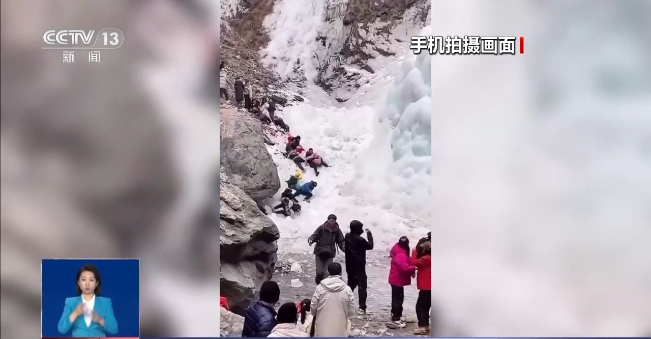 视频显示,一块硕大的冰柱从几十米高空坠落,砸向下方正在游玩拍照的十几名市民。