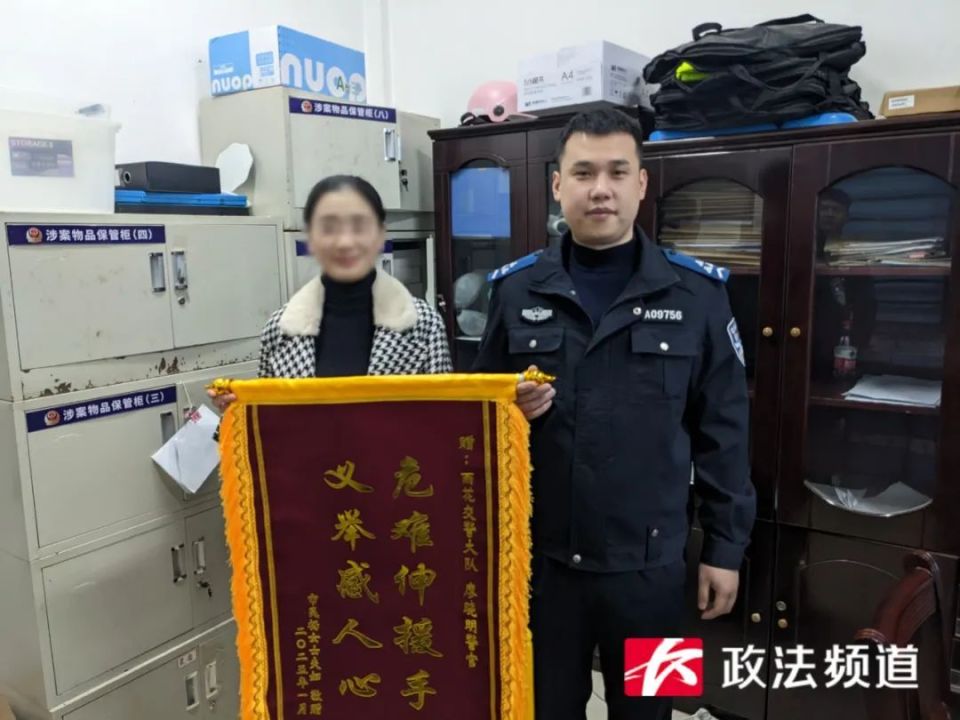近日,长沙市民杨女士专程前往雨花交警大队突击中队办公室,给辅警廖晓明送上一面印有“危难伸援手 义举感人心”的锦旗。