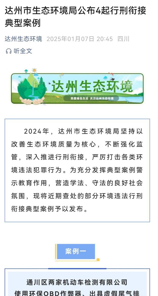 1月7日,达州市生态环境局公布4起行刑衔接典型案例,其中包括“通川区两家机动车检测有限公司使用环保OBD作弊器、出具虚假尾气排放检验报告案”和“宣汉县某机动车检测有限公司破坏计算机信息系统案”。