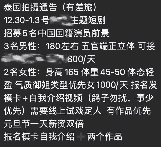 2024年12月27日凌晨2点,范虎在兼职演员群看到一则泰国剧组的招募邀约,试戏男主和男配角。试戏片段发出后,国内中间人马新(化名)告知范虎,试戏通过,“正好那边男主要鸽了”,范虎被制片人赏识,很适合顶替男主,待遇是“一天四位数。元旦假期,再翻双倍”。除了范虎,还有三位演员“被选中”,马新还把范虎和其他三人拉进一个小群,让他们彼此照应。