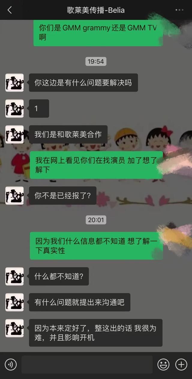 此后,范虎添加了自称泰国知名影视公司歌莱美选角团队负责人“歌莱美传播-Belia”,对方告诉范虎,角色在2小时内迅速敲定。